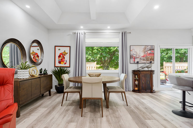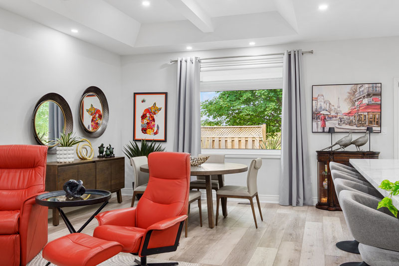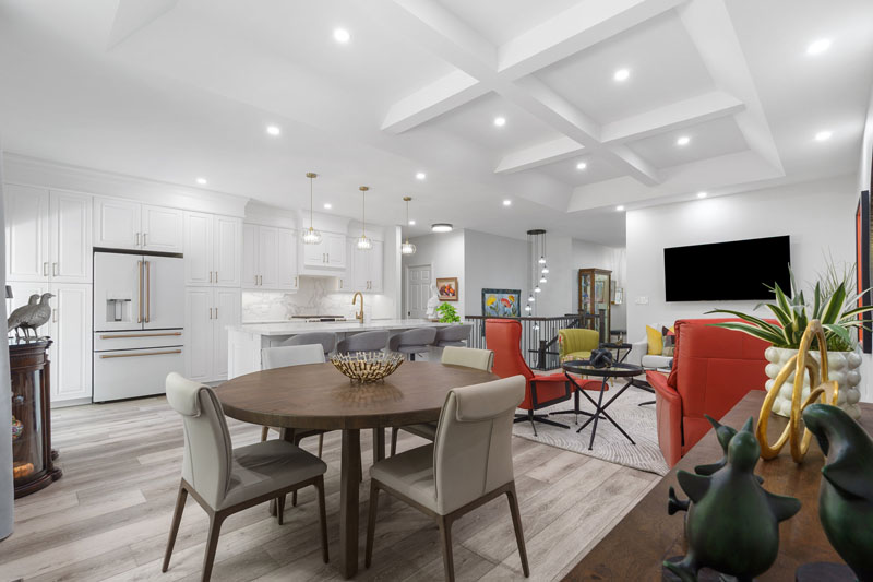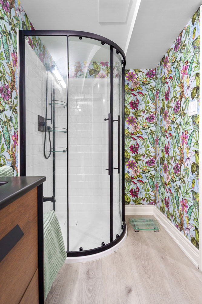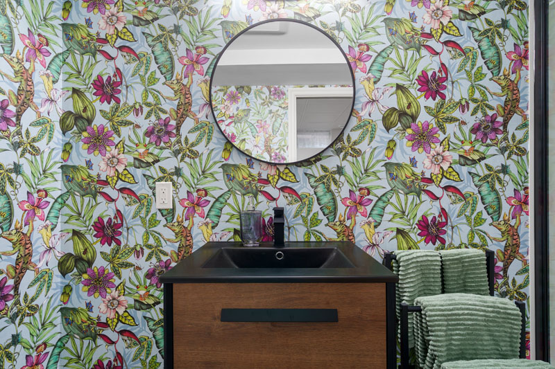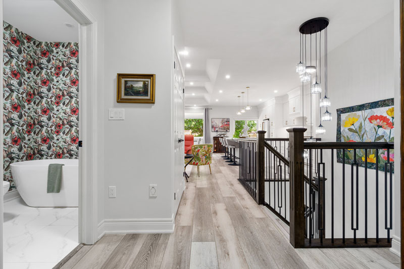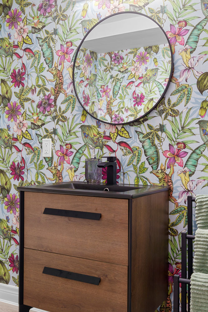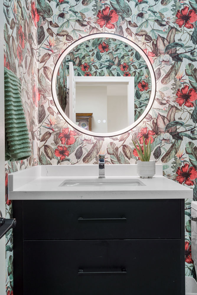 Highlights include a bold, wallpaper-clad bathroom that infuses character and vibrancy, as well as carefully orchestrated lighting that enhances architectural features and sets the mood in every room. The result is a home that feels intentional and inviting—where every element, from millwork to lighting, works in harmony.